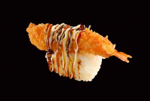 Dùng Fried Shrimp Sushi cùng với nước tương, gừng và wasabi.
